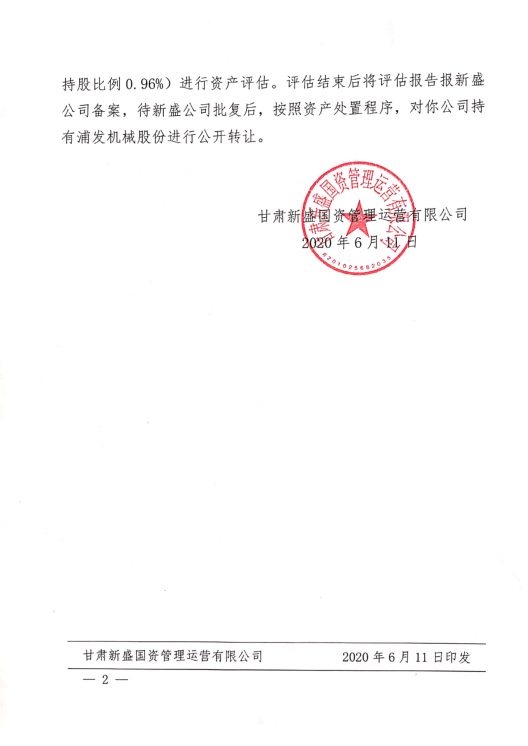 非常感谢贵单位对我公司出具的甘广合评报字(2020)第032号《甘肃机械集团公司拟转让持有中国浦发机械工业股份有限公司0.9581%股权资产项目资产评估报告》审核提出的宝贵意见。我们对贵单位提出的意见和建议进行了认真的研究和核实,现作如下答复并附上修改后的评估报告,如有不妥或不详尽之处敬请批评指正。